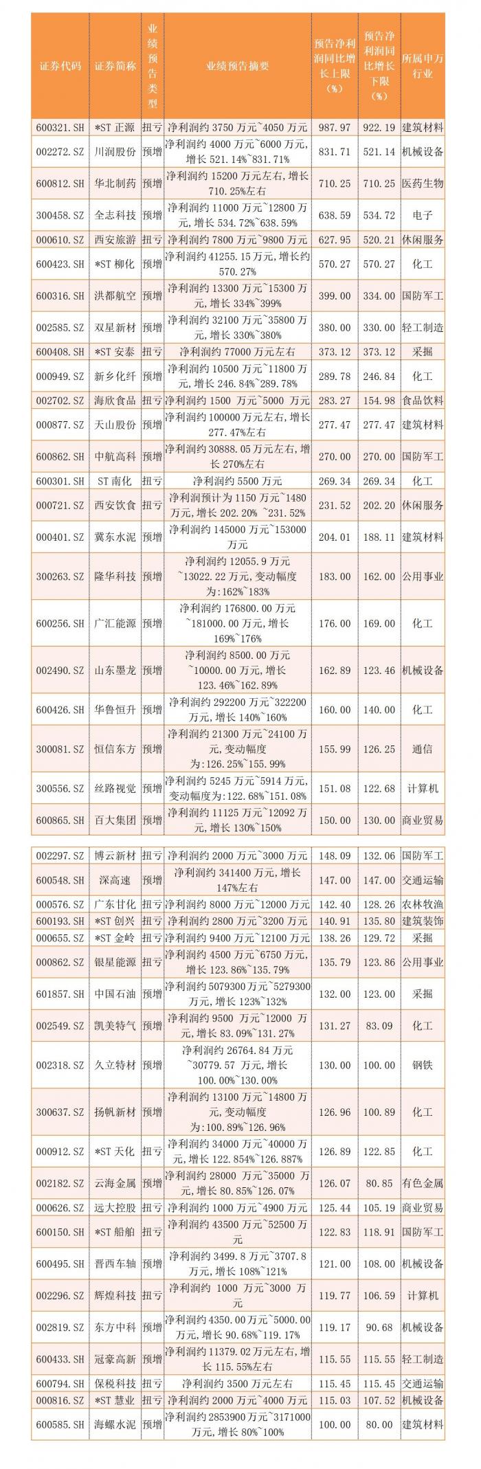 其中*ST正源、川润股份、华北制药、全志科技、西安旅游、*ST柳化净利润同比增长更是有望超过500%。