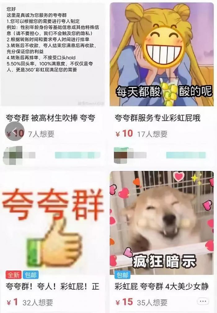 记者在电商平台搜索“夸夸群”,发现现在的“夸夸群”已经不满足于单纯的夸奖,而是在“服务人员”的综合素质及人数上做起了包装,例如“北清复交文科专业高端群”“120人超大群”“颜值在线美少女夸夸群”等。