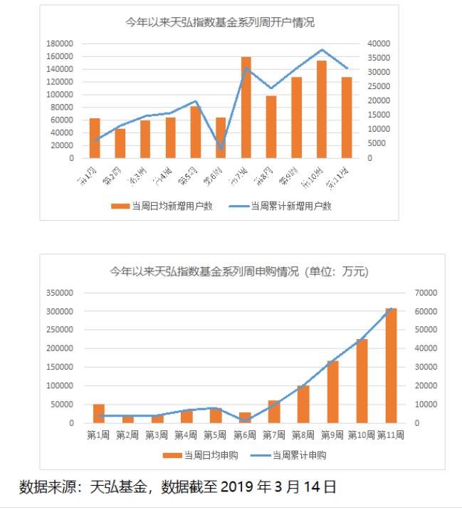 据统计,上周(3月8日-14日)天弘指数基金系列(由11只指数产品组成)累计新增用户14.3万,年内累计新增用户更是突破100万;当周累计申购近31亿元,环比增加了36%。