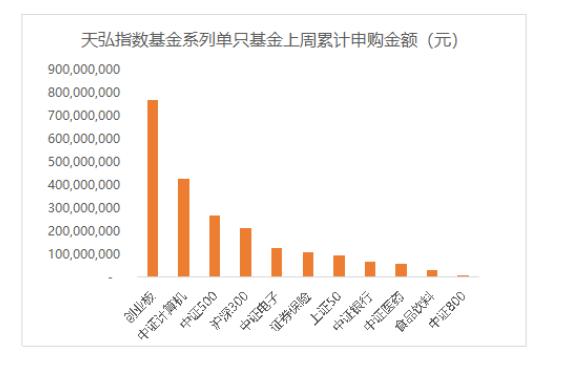 天弘基金数据显示,宽基指数方面,天弘上周最受青睐的是天弘创业板,其次分别是中证500、沪深300、上证50和中证800。