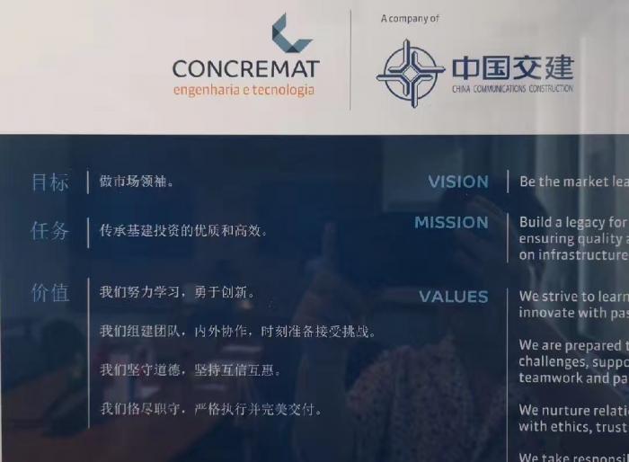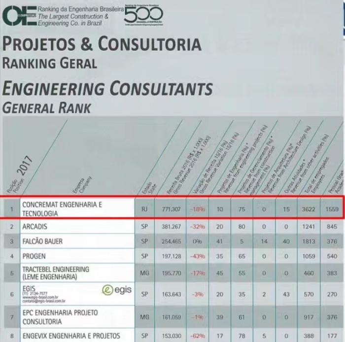 2016年,中交建以1亿美元收购了巴西著名设计公司康科玛特(Concremat)。这是一家成立于1952年的家族企业,主营业务包括工程管理、勘察、设计、监理、环境与社会影响评估及材料检测等,2017年在巴西最大建筑工程公司500强中工程咨询公司排名位列第一。