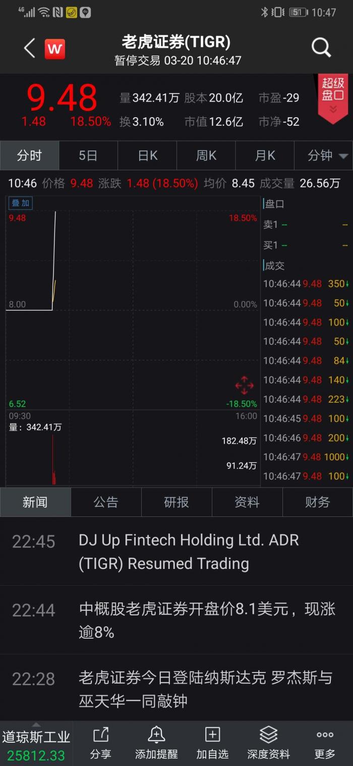 互联网券商上市的竞赛日益激烈,本月继富途证券之后,另一家国内排名靠前的互联网券商老虎证券也在北京时间20日晚正式登陆纳斯达克,股票代码“TIGR”发行价每股8元,这也意味着互联网券商的竞争进入“上市圈”。开盘后,老虎证券的股价涨幅达到18.5%,股价报收于9.48美元每股。