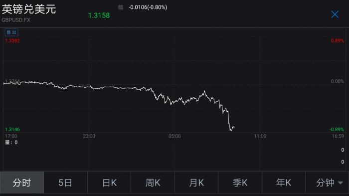 当地时间3月20日早间,英镑兑美元暴跌逾0.8%,截至记者发稿,跌0.8%,报1.3158,一度曾下跌至1.3146。暴跌的原因主要是英国与欧盟间就延长脱欧产生分歧。