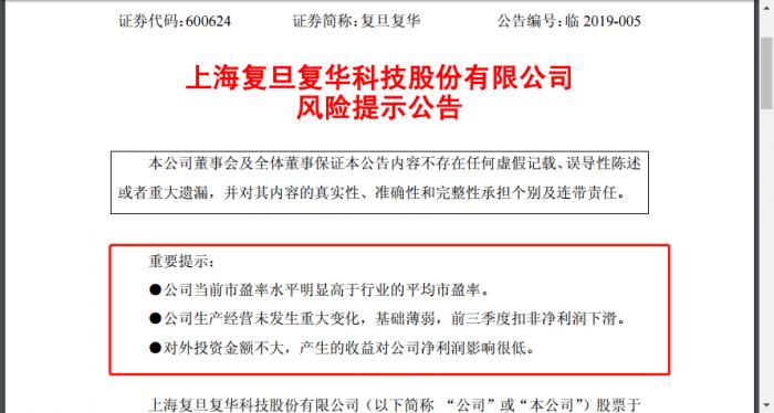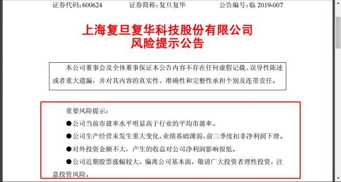 由于股价持续飙涨,复旦复华3月19日晚间发布风险提示公告。