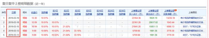 从龙虎榜数据可见,复旦复华分别于3月13日、15日、18日、19日连续四次上榜。