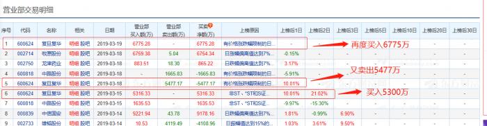 值得注意的是,这些游资大佬在复旦复华可谓是“昼伏夜出”,例如“赵老哥”所在席位就上演了3月15日买入5300万,3月18日卖出5400万,3月19日又买入6700万的连环操作。