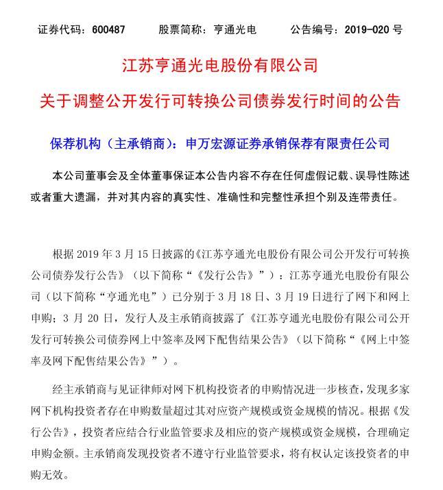 3月21日,亨通光电(600487.SH)公告称,经主承销商与见证律师对亨通转债网下机构投资者的申购情况进一步核查,发现多家网下机构投资者存在申购数量超过其对应资产规模或资金规模的情况。