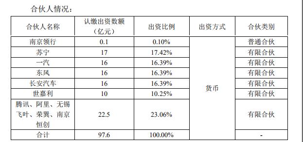 合伙企业的规模及认缴出资总额为人民币97.6亿元,出资方式为货币出资,合伙类别为有限合伙。其中,苏宁出资17.42%,三大汽车央企分别出资16.39%。