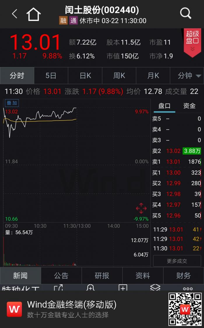 受市场预期传导,闰土股份(002440.SZ)股价在3月22日早盘大幅上涨9.88%,并且盘中一度涨停。