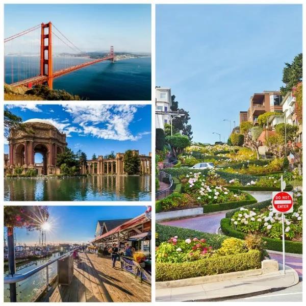 游览景点:参观是旧金山的标志【金门大桥】,它位于旧金山外港的金门海峡之上,大桥色彩鲜艳,建筑伟。独特的【九曲花街】,精雕细琢的【艺术宫】,充斥着各种海鲜小吃的【渔人码头】(此天晚餐敬请自理,推荐在渔人码头尝试当地特色海鲜餐)。