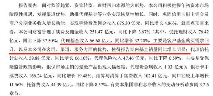 招行表示,本公司积极把握年初资本市场阶段性机遇、发挥渠道优势,助推代理基金等业务实现恢复性增长。其中,代理基金收入66.68亿元,同比增长32.20%,主要是客户基金购买需求回升,以及本公司在客群、渠道、服务方面的优势,使得报告期内基金销量同比增长明显。