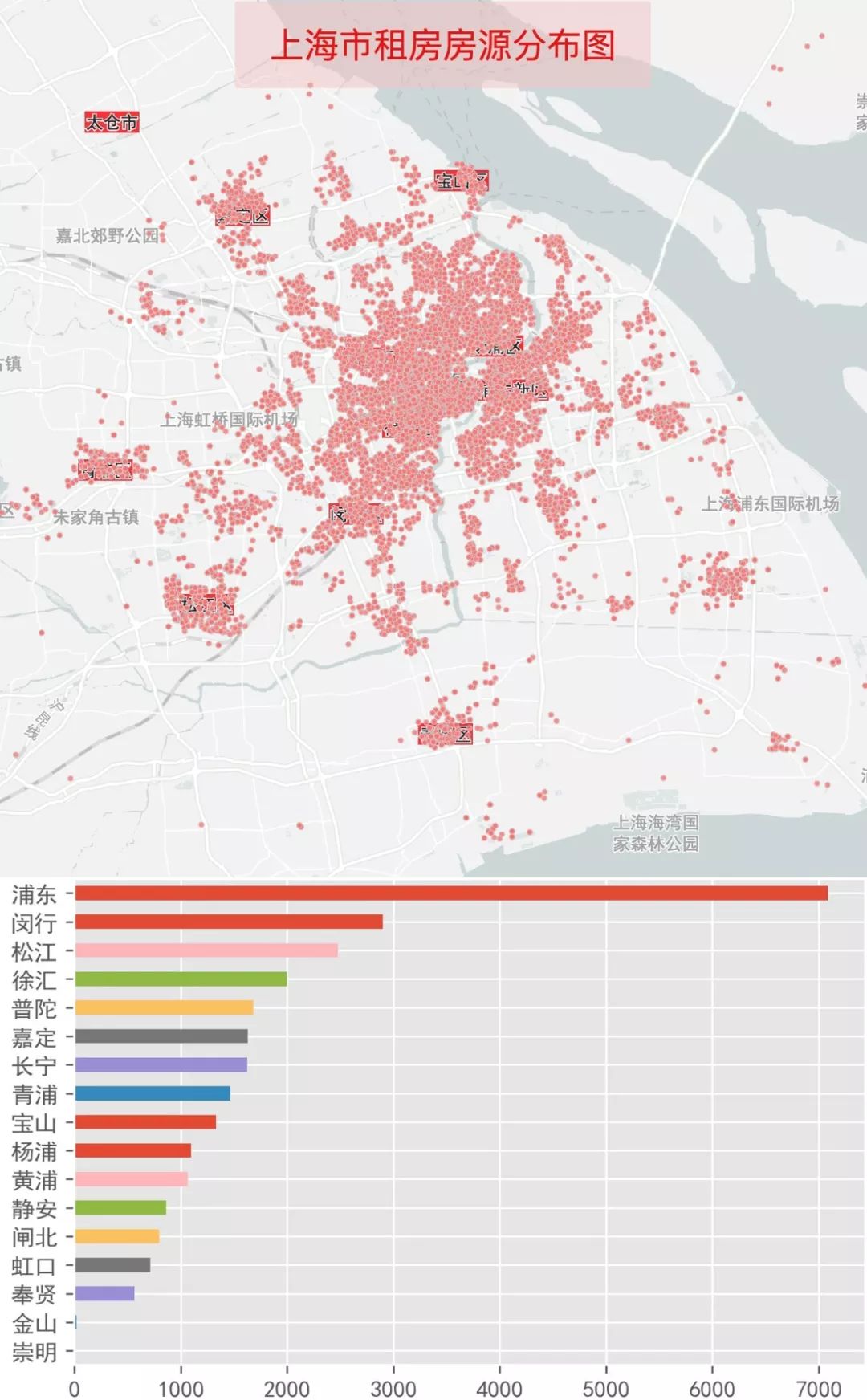 上海也一样,除了周边的宝山、嘉定、青浦、松江、奉贤等区中心有房源外,房源主要集中在中心城区+浦东(地铁网范围内)。总共27311条房源,浦东就有7000多条,比例超过1/4。