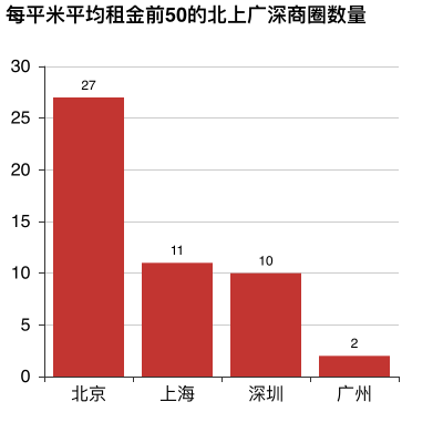 按商圈来看,每平米平均租金前50的商圈中,北京就占了27个,上海和深圳分别是11和10个,广州最少,只有2个。