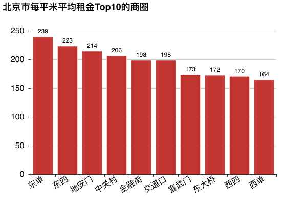 北京每平米平均租金前10的商圈,租金在每平米200元左右徘徊。最贵的商圈东单,每平米要239元,也就意味着,在东单租一个30平的房子,一个月需要7170块钱,租一个80平的房子,一个月需要19120元。