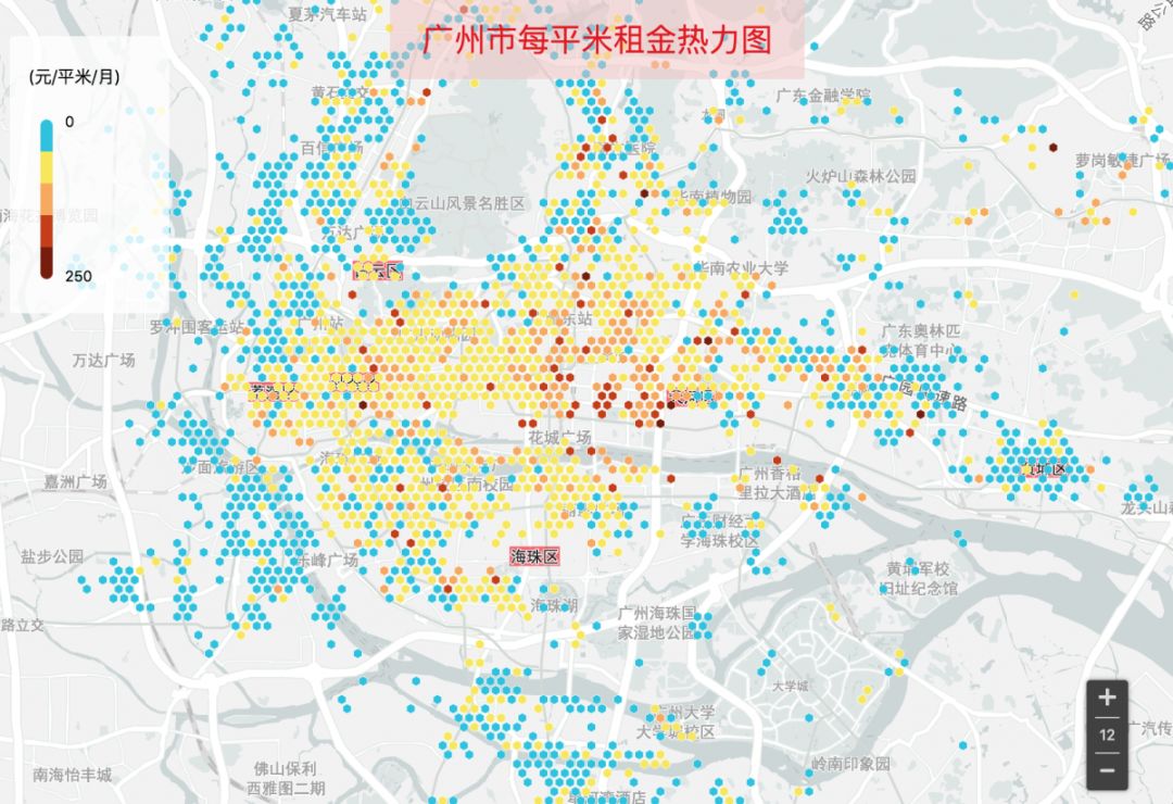 相较北京和上海,广州每平米月租金明显以100元以下的房源占主导。100元以上的比较零星,主要分布在体育中心、跑马场、以及岗顶站周围,荔湾、越秀中心也有一些。看来广州还是一个租房比较友好的城市啊。
