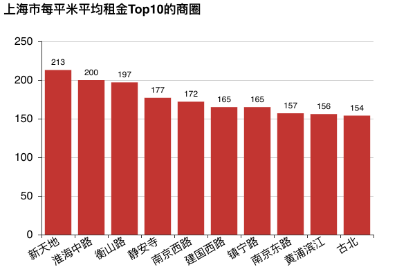 上海每平米平均租金前10的商圈较北京要好一些,租金在170元左右徘徊。其中租金最高的商圈新天地,每平米租金为213元。