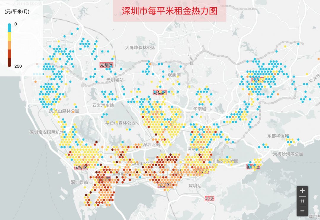 深圳每平米租金大于100元的房源主要集中在南山区(深大、深圳湾、科技园)、福田区(特别是梅林和香蜜湖)、以及罗湖区。宝安、龙华、布吉主要以每平米租金50-100元为主,11号线碧头端以及龙岗区主要以每平米租金50元以内为主(是不是有很多小伙伴愿意租在这里,搭地铁去市区上班的?)。