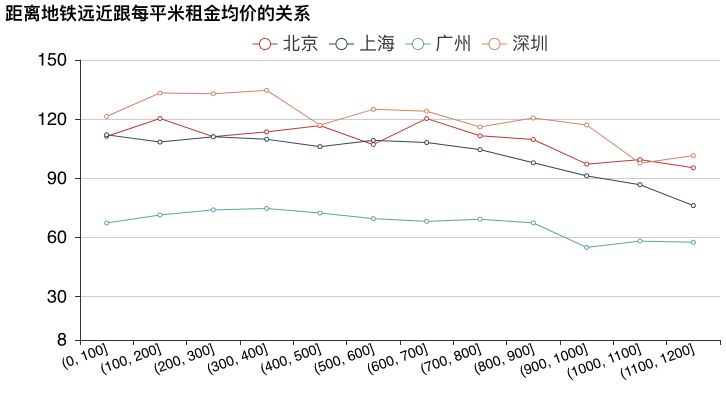 可见,北京市只要地铁在900以内,每平米租金变化不大。900米和1000米租金差距为12.5元,也就是说,租一个20平的房子,距离地铁站900米和1000米的租金差距是250元。