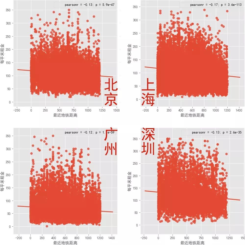 租房,其中一个终点考虑的因素就是距离地铁的远近。我们把个城市房源距离最近地铁站的距离跟每平米租金进行了回归分析,并且计算了相关系数。