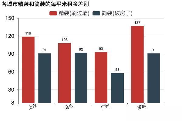 可以看到,北上广深精装的房子比简装的房子平均每平米租金要分别贵:28、16、35、46元。深圳的精简装差别最大。也就是说,在深圳租一个20平精装的房子要比简装的贵上920元!