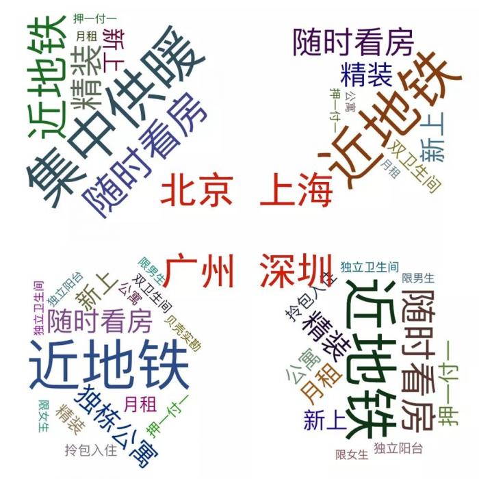 最后,我们对每个房源的标签进行了统计,并且绘制了词云图,可以看出各城市租房时思考的侧重点。