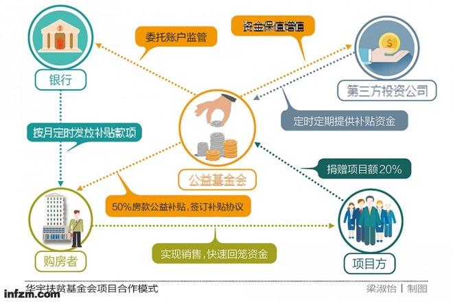 开发商以高于楼面价约20%的价格划拨一批房屋,作为“专项扶贫房”出售给购房者;开发商得到购房款后,将购房款中的20%一次性捐赠给公益基金会;公益基金会拿到钱款,通过投资、运作获利,分20年返还给购房者50%的房款,实现宣传中“买房返还补贴”的效果。