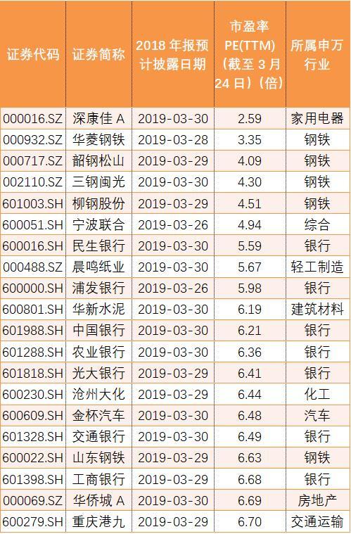 截至3月18日收盘,市盈率(TTM)最低的20家均不超过7倍,所属行业集中在银行和钢铁。