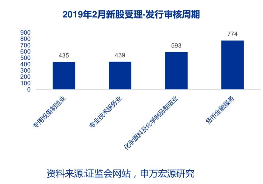 从行业角度看,2019年2月,专用设备制造业、专业技术服务业审核周期较短,均不足500天,货币金融服务业较长,为774天。