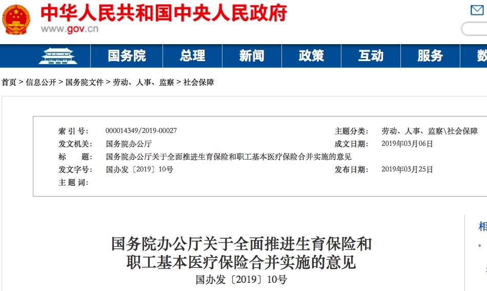 3月25日,国务院办公厅发布了《国务院办公厅关于全面推进生育保险和职工基本医疗保险合并实施的意见》(以下简称《意见》)。《意见》明确,生育保险基金并入职工基本医疗保险基金,统一征缴,统筹层次一致。而且合并要在2019年底前实施。