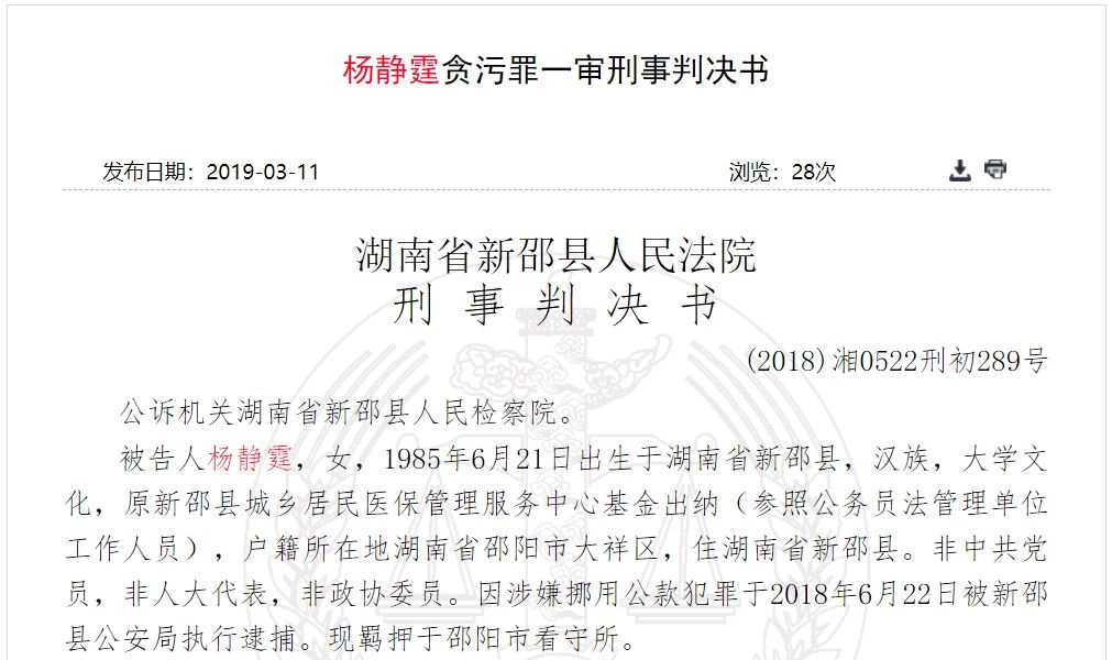 2019年2月22日,法院一审判决认定被告人杨静霆犯贪污罪,判处有期徒刑10年6个月,并处没收个人全部财产;对被告人杨静霆的违法所得586.1747万元予以追缴,上缴国库(已退还150.3813万元至新邵县城乡居民医保中心)。