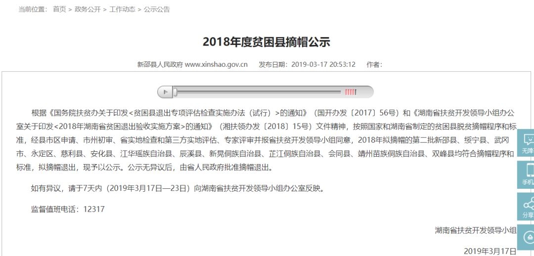 每经小编(微信号:nbdnews)注意到,不久前,新邵县人民政府才刚公布了2018年度贫困县摘帽公示。