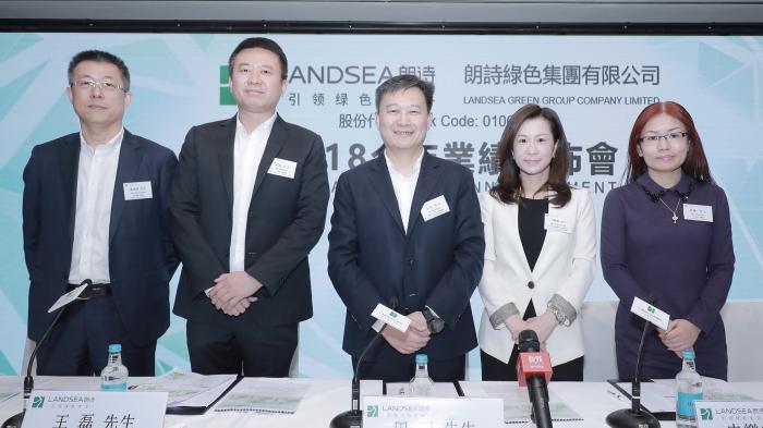 (从左至右依次为:朗诗执行董事、副总裁谢远建,执行董事、联席总裁王磊,董事局主席、执行董事兼总裁田明,执行董事、联席总裁、首席财务官申乐莹,执行董事、副总裁周勤)