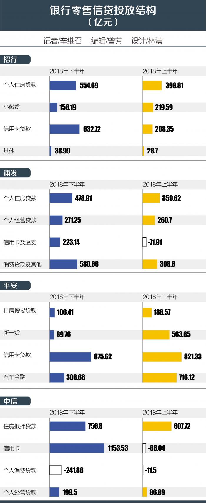 21世纪经济报道记者梳理招行、平安、浦发和中信四家股份制银行财报发现,2018年下半年,个人住房贷款投放略有提速,但信用卡放量猛增,远超上半年和其他零售业务。信用卡业务成为零售业务的“绝对主力”,部分银行有意收缩消费贷款。