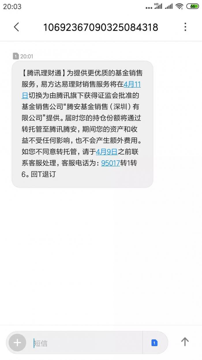 基金君拨通客服电话,经过漫长等待,终于联系上负责腾讯理财通的客服,客服表示目前只有易方达易理财要转托管,由公司直销改为腾安代销;如短信通知所示,腾讯理财通的转托管调整丝豪不会对用户的资产和收益产生影响。后续再有基金要转托管的话,腾讯理财通届时会另再通知用户。