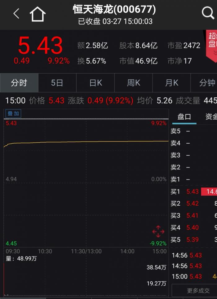 截至3月27日收盘,此前并不显山露水的恒天海龙,已经连续收获了5个涨停板。