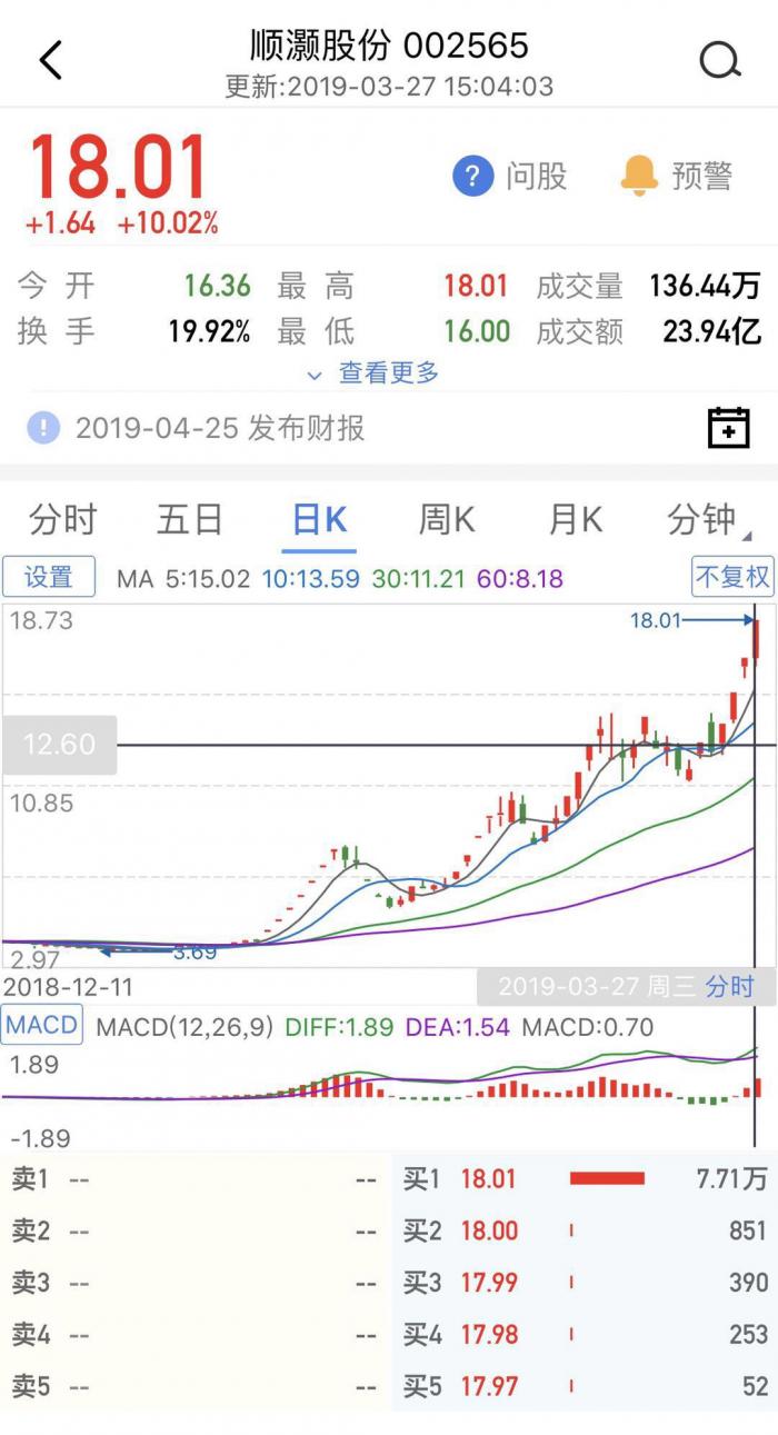 据Wind数据显示,截至3月27日,顺灏股份的股价从年初的3.77元/股飙涨至最新的18.01元/股,股价涨幅为377.72%,区间成交额为382.17亿。而2018年一整年,顺灏股份的成交额仅有36.98亿元。