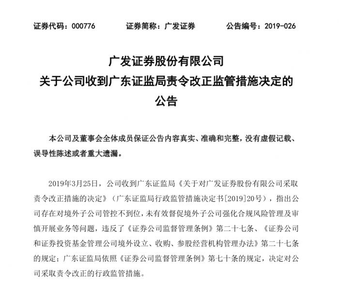 3月25日,广发证券收到广东证监局《关于对广发证券股份有限公司采取 责令改正措施的决定》,指出公司存在对境外子公司管控不到位,未有效督促境外子公司强化合规风险管理及审慎开展业务等问题。