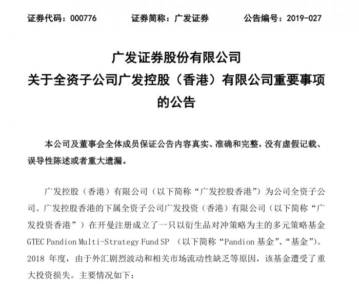 3月26日晚,公告显示,该基金为广发控股香港旗下公司所设,去年因为外汇剧烈波动和相关市场流动性缺乏,亏损达到1.39亿美元,基金年末净值为-0.44亿美元。据彭博社报道,该交易牵扯的正是花旗集团。