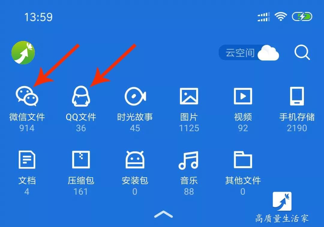 打开这个功能将所有的文件备份,即使是换了新手机,只要在新手机登入腾讯文件,再点击右上角的【云空间】可以看到所有的备份文件了。