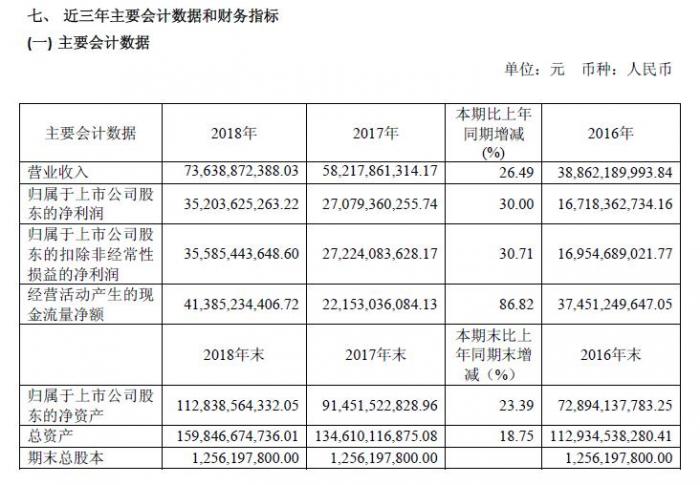 3月28日晚,贵州茅台2018年年报出炉。年报显示,茅台2018年实现营业收入736.39亿元,同比增长26.49%;实现营业利润513.43亿元,同比增长31.85%;实现归属于母公司所有者的净利润352.04亿元,同比增长30.00%。公司拟每10股派发现金红利145.39元。