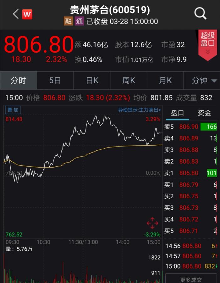 3月28日,贵州茅台股价再次突破800元,收于806.8元/股,市值再度突破万亿。