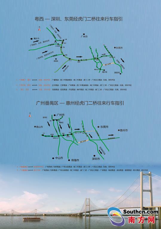 广东省交通集团工作人员建议车主根据出发地和目的地,选择合适道路通行。广州、佛山乃至粤西、广西等地前往东莞、深圳市区,均可行经南二环高速后进入虎门二桥,再顺接相关高速抵达东莞、深圳市区。深圳前往广州市区、佛山市南海区以及往粤西北方向车流建议由黄埔大桥过江;深圳往广州市区方向车流建议行驶广深高速或广深沿江高速。