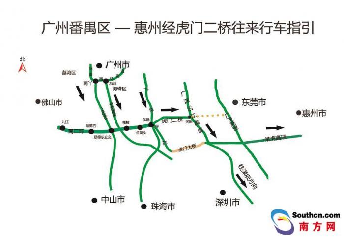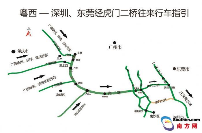 广州番禺区-东莞、深圳市区:广珠西线/东新高速/广珠北段高速-南二环高速-虎门二桥-广深沿江高速-东莞、深圳市区