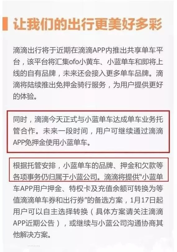 2018年1月9日,滴滴出行和小蓝单车宣布,小蓝单车将托管给滴滴,用户可在滴滴APP内免押金骑行小蓝。而对于人们最关注的小蓝单车的用户押金去留问题,小蓝和滴滴给出的解决方式是将199元的押金转换成等值滴滴单车券和出行券。