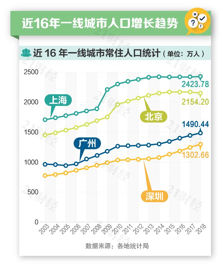 1、近16年来,一线城市常住人口基本保持快速增长。北京、上海常住人口从1000多万人增至2018年的2000多万人;深圳人口增长速度迅猛,早已跃居人口过千万的超大城市;广州常住人口增量也大幅提升。