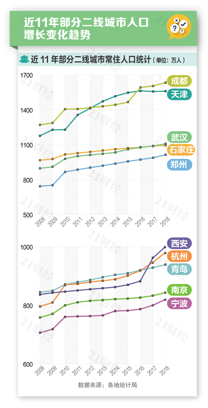 1、2018年成都、武汉、西安、石家庄、郑州、杭州等10个二线城市均发布人才新政,但从历年数据上看,常住人口变化大多延续以往趋势,其中,郑州、西安常住人口首次超过1000万。