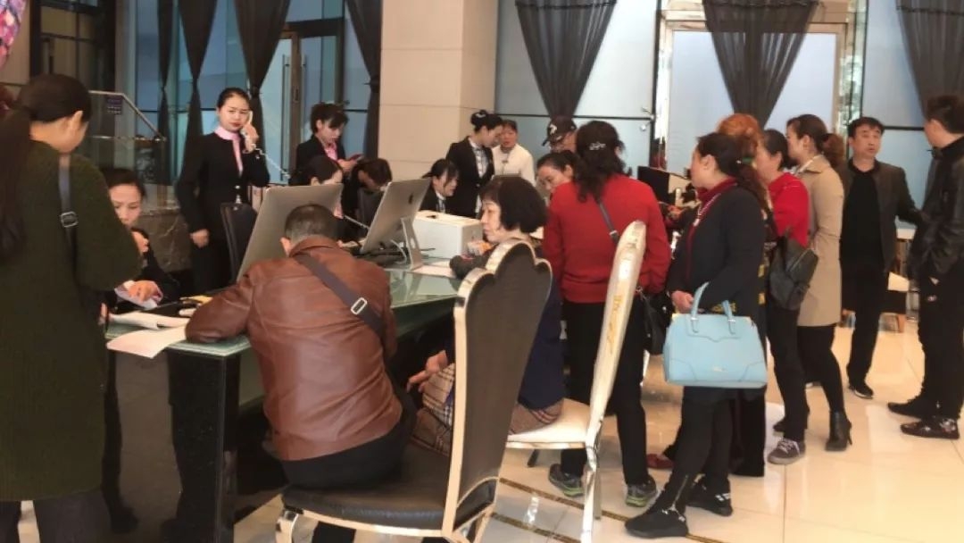 3月25日,亢龙太子金融店挤满了要求退款的消费者。一位老人告诉“镁刻地产”记者,原本儿子媳妇五月份在这里办喜酒,现在听说酒店可能停业,订金退也不是,不退也不是。接待员则不停地安慰说,酒店不会有任何问题。