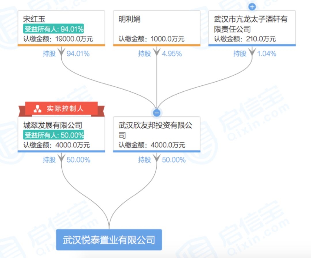 据企信宝,武汉悦泰置业有限公司股权结构原为中信泰富香港城翠公司与宋红玉实际控制的武汉欣友邦投资有限公司各占50%。