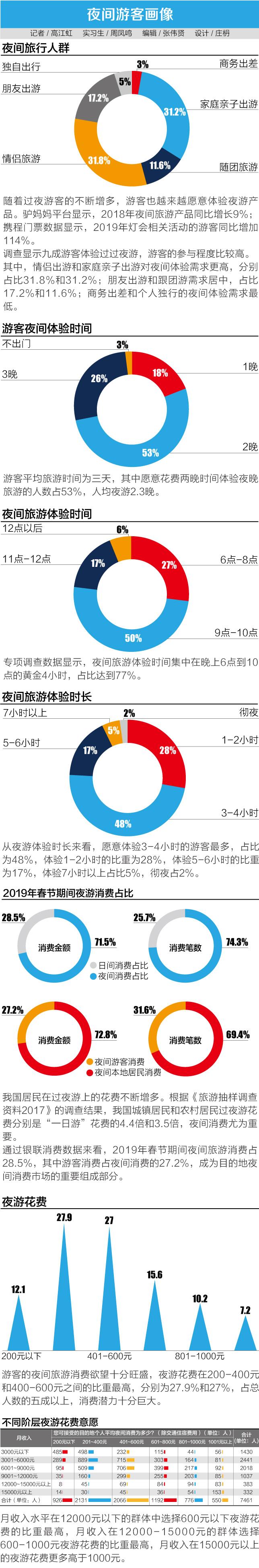事实上无论北方还是南方,人们对夜间活动需求在日渐增长。据文化和旅游部重点实验室研究员张佳仪介绍,据其调查,去年游客平均旅游时间为三天,其中愿意花费两晚时间体验夜晚旅游的人数占53%,人均夜游2.3晚。随着过夜游客的不断增多,游客也越来越愿意体验夜游产品。驴妈妈平台显示,2018年夜间旅游产品同比增长9%;携程门票数据显示,2019年灯会相关活动的游客同比增加114%。
