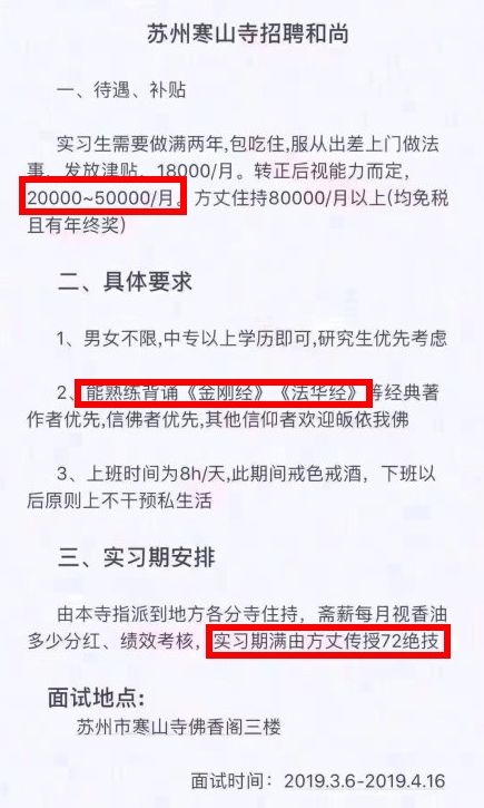 近日,网上出现了一条“诱人”的招聘广告,招聘中写道:“苏州寒山寺招聘和尚,实习生需做满两年,发放津贴,18000/月,转正后视能力而定,20000-50000/月……”,不仅如此,实习期满就由方丈亲自传授72绝技!